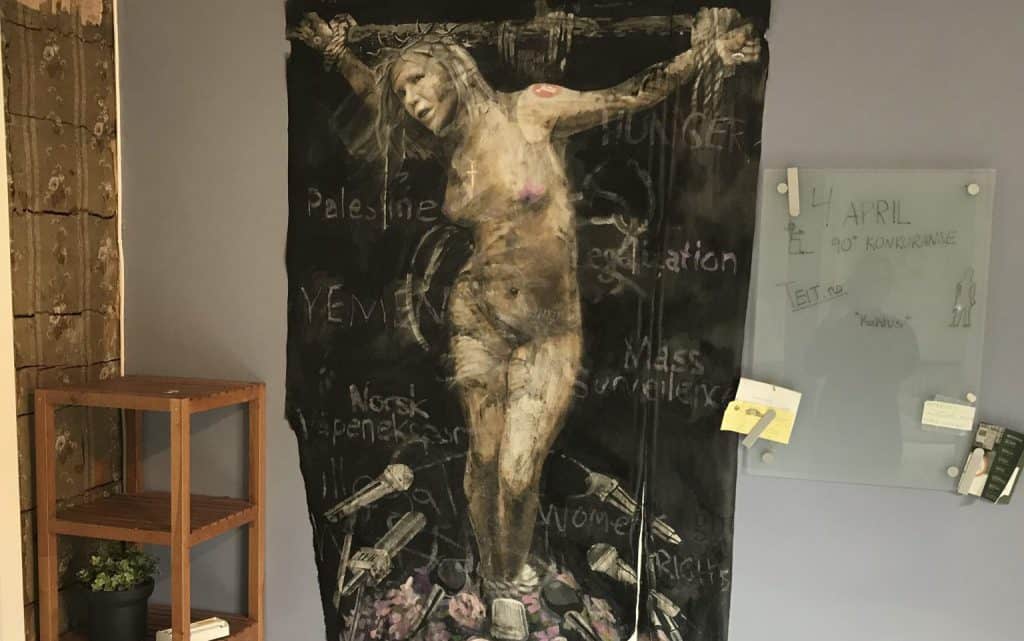 Bildet skapte kraftige reaksjoner og ble sprayet over med spraymaling natt til onsdag. Deretter tok studentene i kollektivet bildet med seg natt til fredag og klarte å restaurere det ved å bruke fire flasker med neglelakkfjerner.