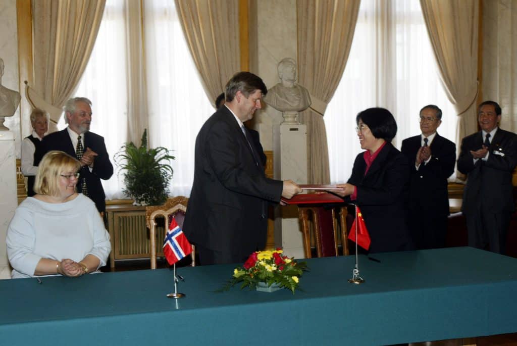 Norge og Kina undertegnet i 2004 en avtale som for første gang gjorde det mulig for kinesiske turister å få visum for innreise til Norge. Seremonien foregikk i Stortinget med daværende kommunal- og regionalminister Erna Solberg, næringsminister Ansgar Gabrielsen og Kinas ambassadør i Norge Chen Naigung. Foto: Terje Bendiksby / SCANPIX