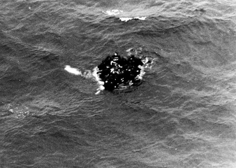 Atomubåten Komsomolets sank ved Bjørnøya 7. april 1989. Her ser vi overlevende ubåtmannskaper som klamrer seg til en livbåt. Foto: Kystvakten / NTB SCANPIX