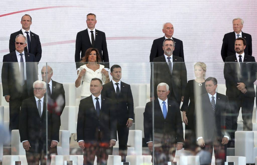 Utenlandske statsledere, blant dem USAs visepresident Mike Pence, under minnemarkeringen i Warszawa for starten på annen verdenskrig. Foto: Czarek Sokolowski / AP / NTB scanpix