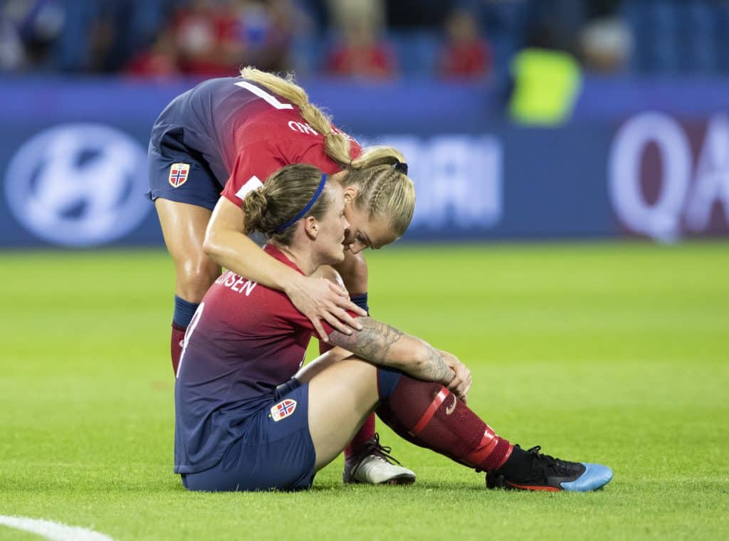 Norges Isabell Lehn Herlovsen (sittende) og Lisa-Marie Utland etter at England-tapet var et faktum. Foto: Terje Bendiksby / NTB scanpix.