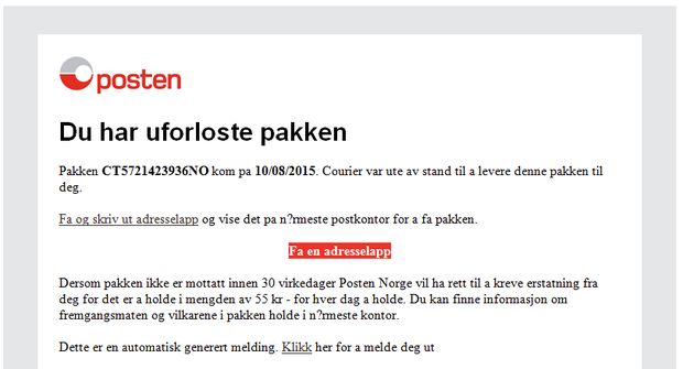 – De siste dagene har vi igjen sett flere tilfeller av det meget skadelige e-post-viruset CryptoLocker. Avsender utgir seg for å være Posten Norge og budskapet er «Du har uforløste pakken» eller lignende, advarer selskapet i en pressemelding.