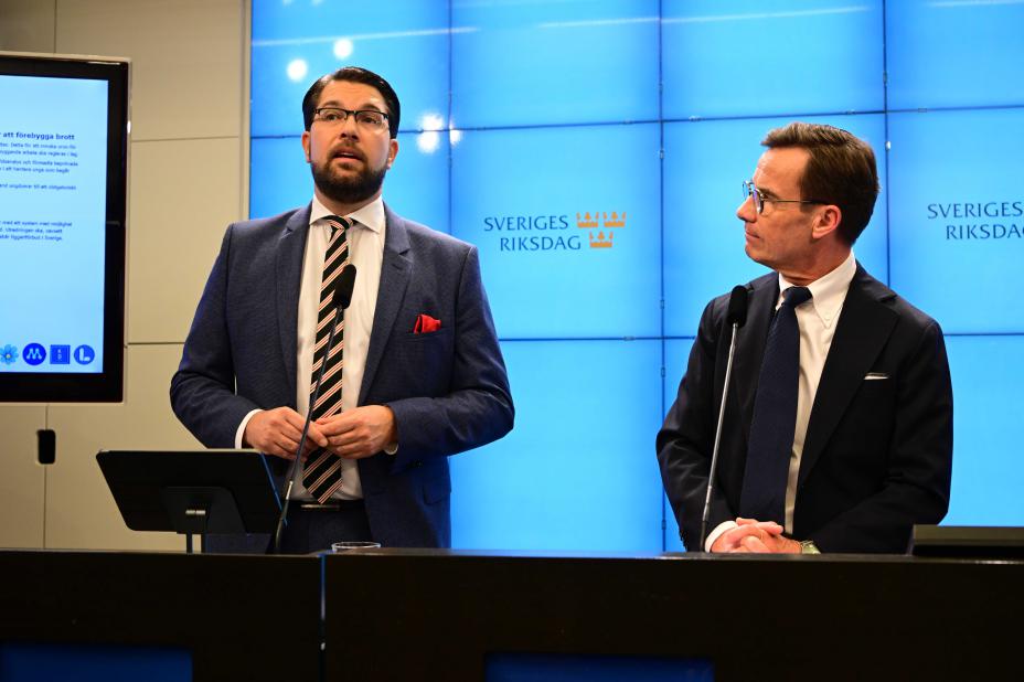 Politikk: Åkesson deltok fredag på en pressekonferanse der Moderaternas leder Ulf Kristersson la fram sitt regjeringsprosjekt. Sverigedemokraterna deltar ikke i regjeringen, som består av Moderaterna, Liberalerna og Kristdemokraterna.