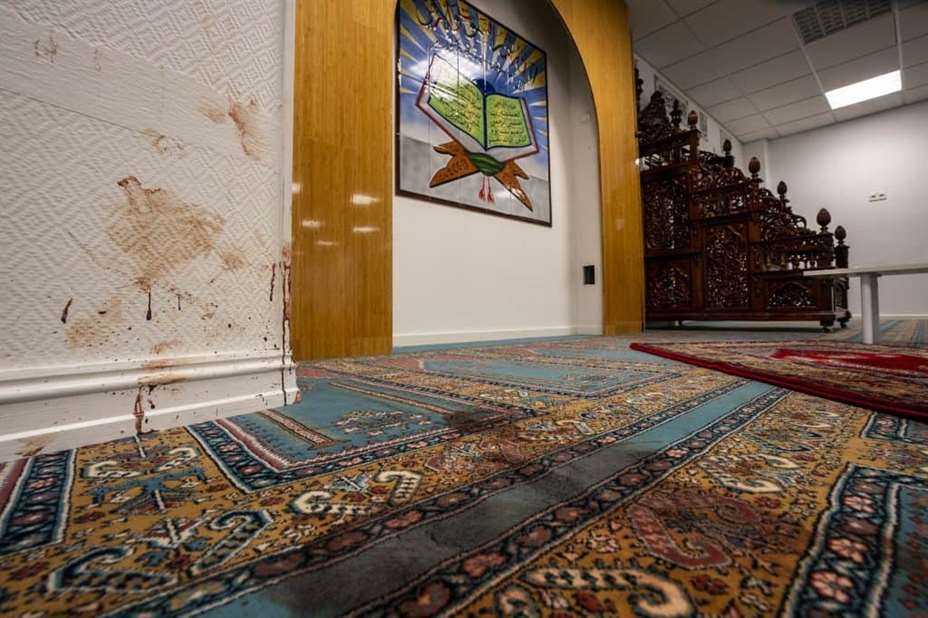 Kulehull i veggene, glasskår og blod på teppene i bønnerommet er synlige spor etter hendelsen i Al-Noor-moskeen i Bærum forrige lørdag.
