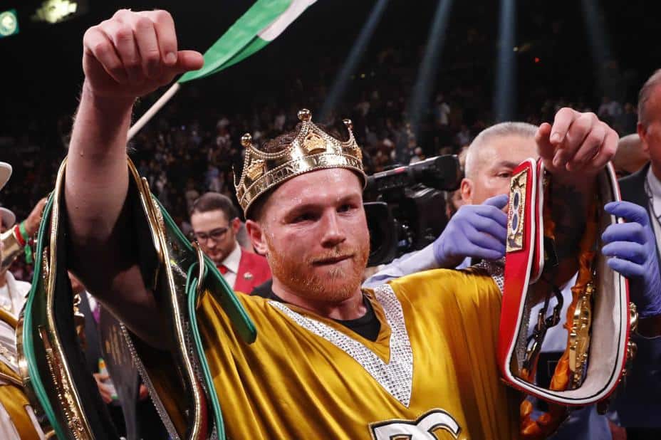 Saul Canelo Alvarez feirer etter å ha slått Caleb Plant. Foto: Steve Marcus / AP / NTB