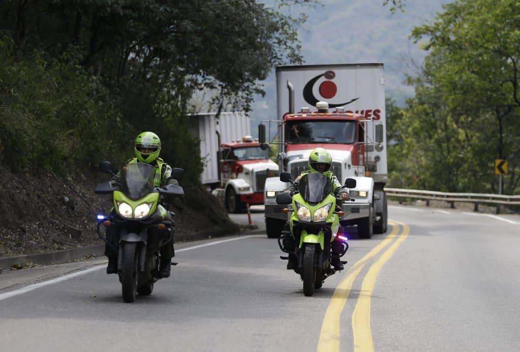 Lastebiler med amerikansk hjelp fikk eskorte av colombiansk politi på vei til grensa til Venezuela. Foto: Fernando Vergara / AP / NTB scanpix