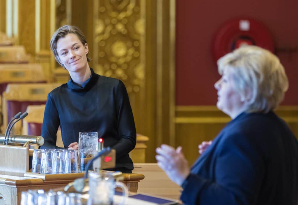 Anette Trettebergstuen (Ap) stiller her spørsmål til statsminister Erna Solberg (H) under muntlig spørretime på Stortinget onsdag. Trettebergstuen er innstilt som ny leder av Arbeiderpartiets kvinnenettverk etter at Anniken Huitfeldt ønsket å gå ut av det vervet. Foto: Gorm Kallestad / NTB scanpix
