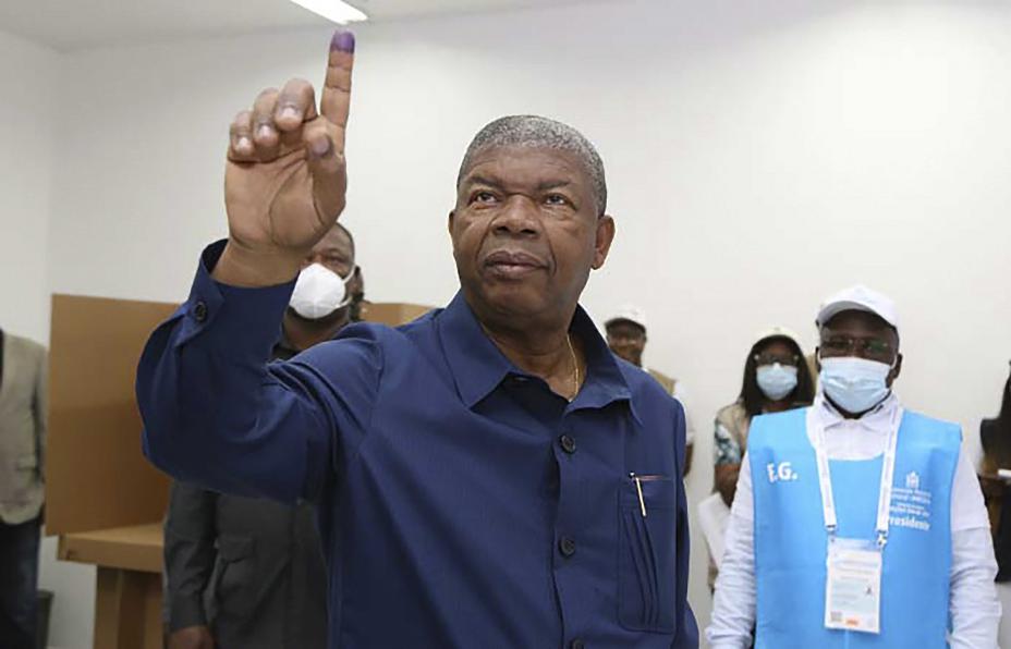 President Joao Lourenco holdt opp en finger med blekk på fingertuppen da han avga sin stemme onsdag. Han og partiet hans MPLA håper å kunne fortsette å styre det afrikanske landet også i den kommende perioden. Foto: AP / NTB