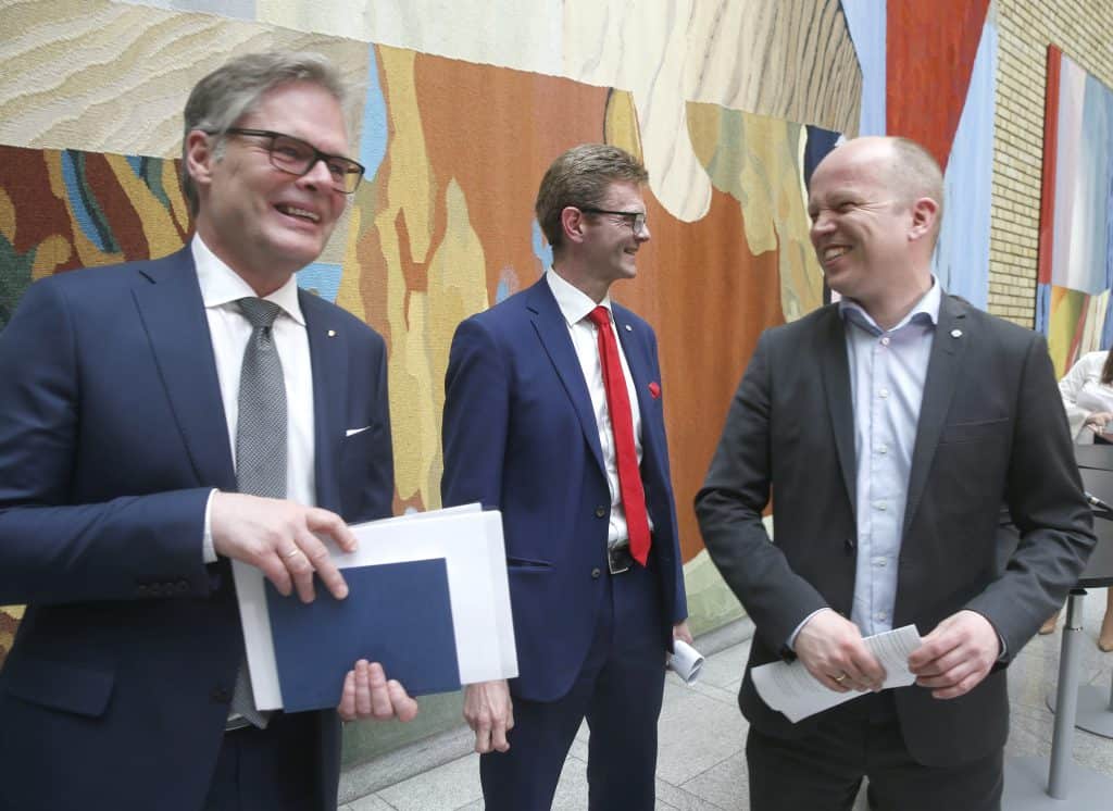Frps Hans-Andreas Limi (til venstre) er optimist tross svake tall på den nye målingen, mens Sp-leder Trygve Slagsvold Vedum (til høyre) gleder seg over å kapre velgere fra Frp. Terje Breivik og Venstre oppnår bare en brøkdel av oppslutningen til de to andre. Arkivfoto: Vidar Ruud / NTB scanpix