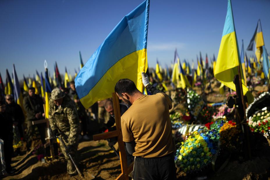 Ukrainske flagg under begravelsen til en 22 år gammel soldat i Kharkiv tidligere denne uken. Foto: Francisco Seco / AP / NTB