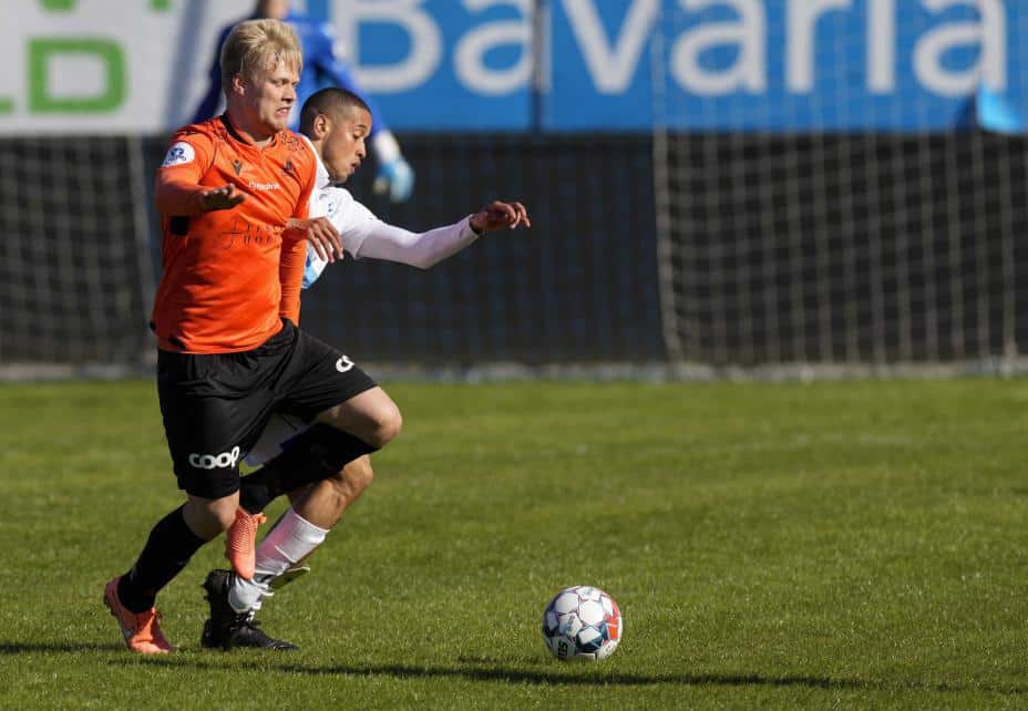 Åsanes Håkon Lorentzen i duell med Haugesunds Bruno Leite (bak) i treningskampen i fotball mellom FK Haugesund og Åsane på Haugesund stadion i april. Foto: Jan Kåre Ness / NTB