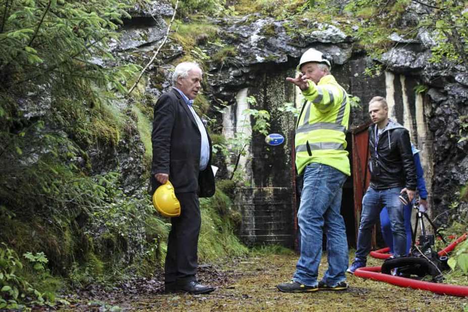 Varaordfører Bård Espelid med representanter fra Askøys vann- og avløpsetat utenfor det tømte høydebassenget på Øvre Kleppe på Askøy. Foto: Jørgen Eide / NTB scanpix