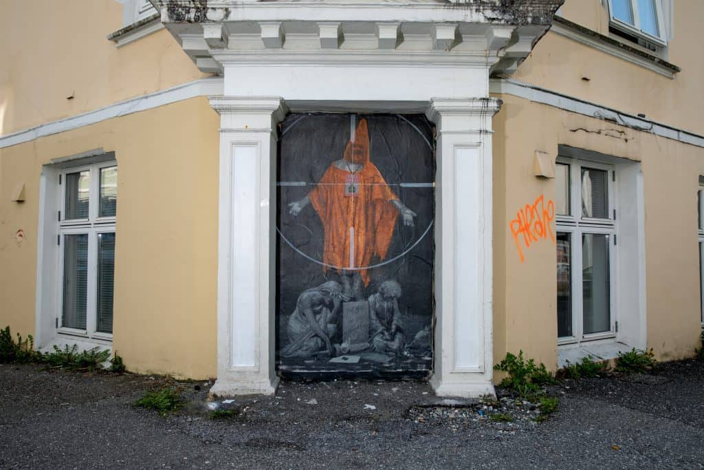 Gatekunstneren AFK har i løpet av natten hengt opp et bilde av WikiLeaks-grunnlegger Julian Assange. Bildet henger på samme sted som det kontroversielle bildet av Sylvi Listhaug ble hengt opp for ett år siden. Foto: Eivind Senneset / NTB scanpix