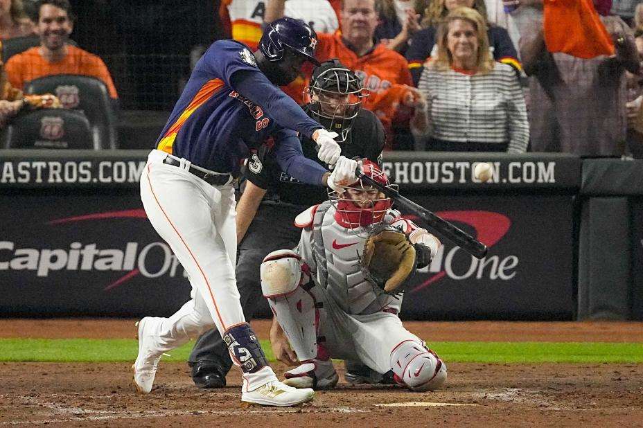 Sport: Lørdagens kamp var lenge en kasterduell mellom Framber Valdez (Astros) og Zack Wheeler (Phillies). Etter fem omganger sto det 0-0, men i 6. omgang sendte Kyle Schwarber et kast fra Valdez opp på tribunen og ga Phillies ledelsen.