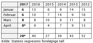 Åtte omkommet i april-trafikken, viser foreløpige tall fra Vegvesenet. 28 i årets fire første måneder, 12 færre enn tilsvarende tid i fjor.