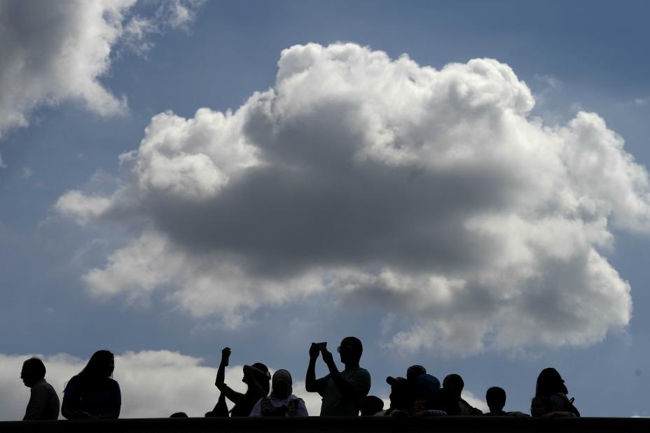 Turister under en lettskyet himmel i London. Ozonlaget, høyt over skyene, beskytter mennesker og dyr mot skadelige ultrafiolette stråler fra sola. Foto: Frank Augstein / AP / NTB