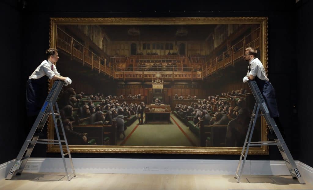 Et stort Banksy-maleri som forestiller Parlamentet der politikerne er framstilt som sjimpanser, er solgt for drøyt 111 millioner kroner på auksjon i London.
