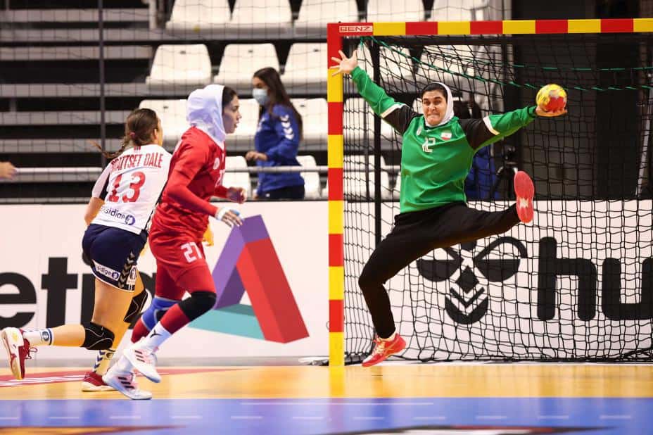 Iran-keeper Fatemeh Khalili Behfar hadde sitt livs kveld da hun stoppet skudd på skudd i VM-kampen i håndball. Norge vant 41-9, men scoringsrekorden overlevde.