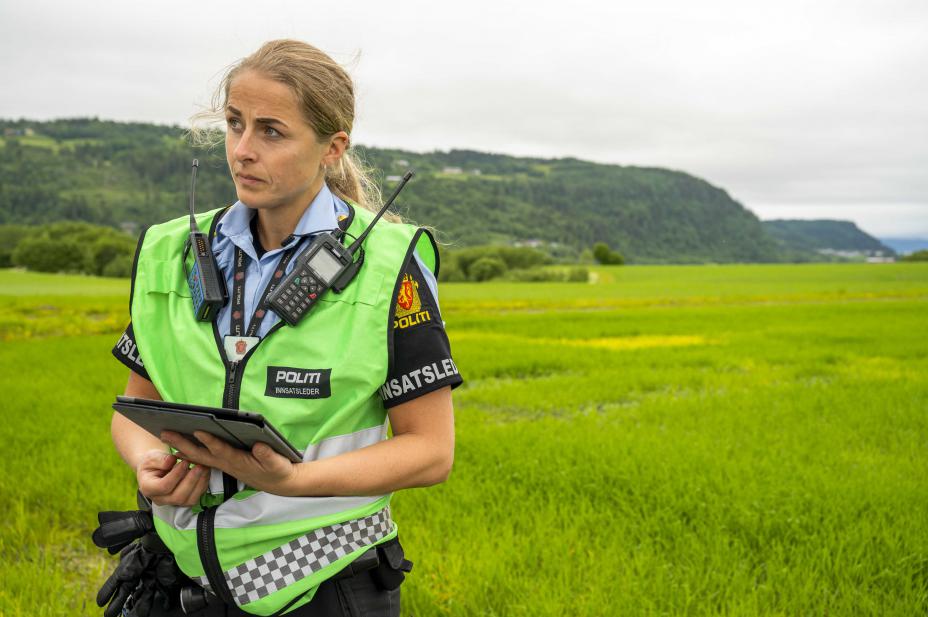 Et barn er sendt til sykehus etter en traktorulykke på en gård i Melhus i Trøndelag. Mari Fløttum er politiets innsatsleder på stedet. Foto: Joakim Halvorsen / NTB