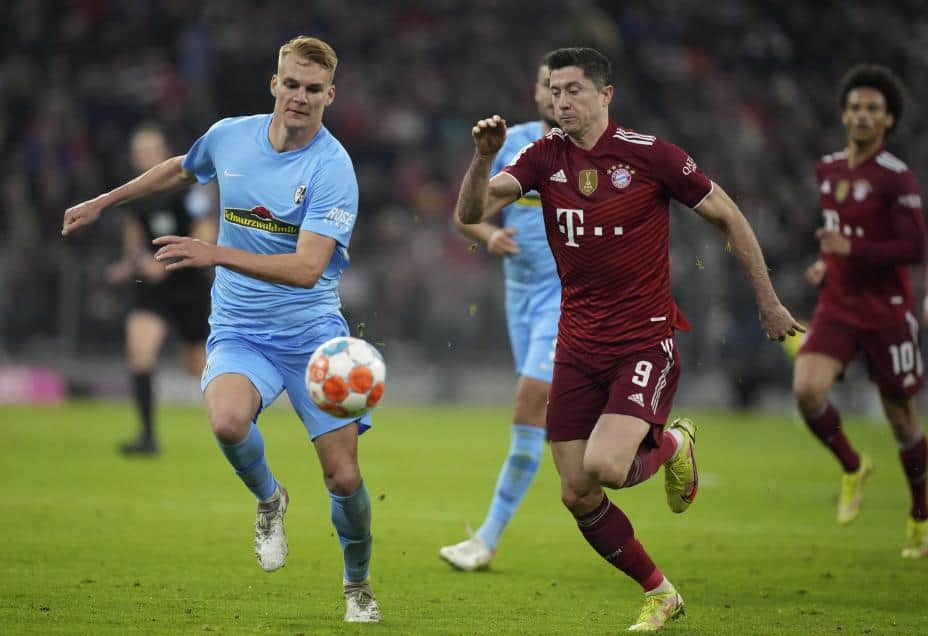 Robert Lewandowski scoret igjen da Bayern München påførte Freiburg deres første tap for sesongen i 2-1-seieren i tysk Bundesliga lørdag.