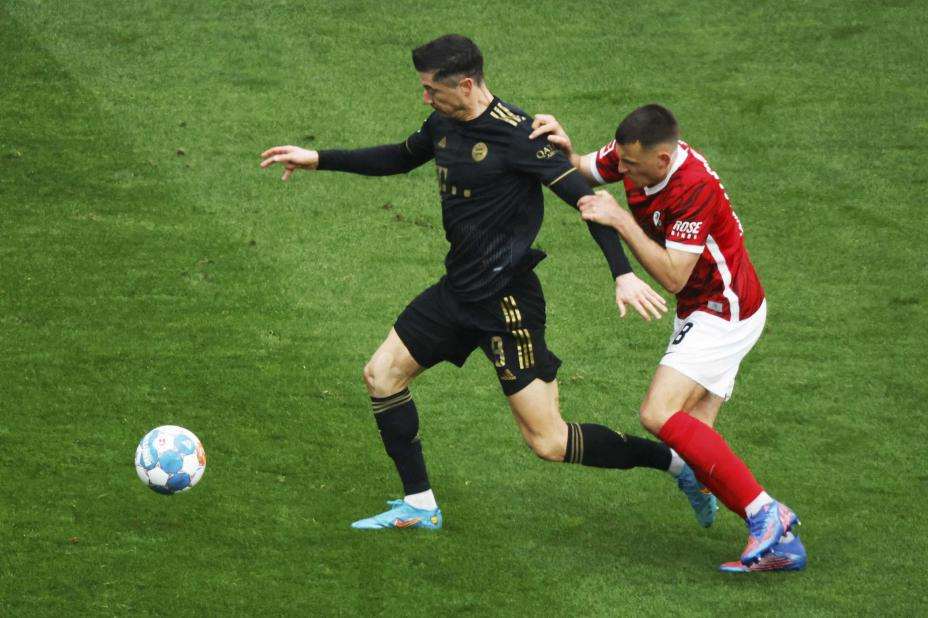 Robert Lewandowski og Bayern München får ingen straff for å ha vært tolv spillere på banen i en kort periode mot slutten av kampen mot Freiburg lørdag. Foto: Philipp von Ditfurth / dpa via AP / NTB