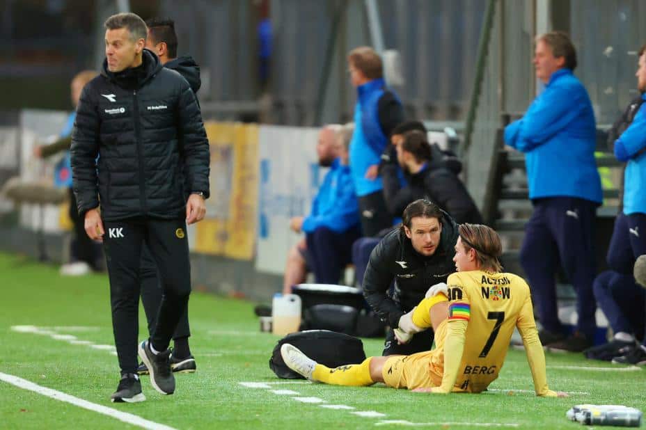 Sport: Berg gikk av banen etter å ha fått seg smell i kampen mot Strømsgodset søndag. Umiddelbart ble det fryktet en alvorlig kneskade.