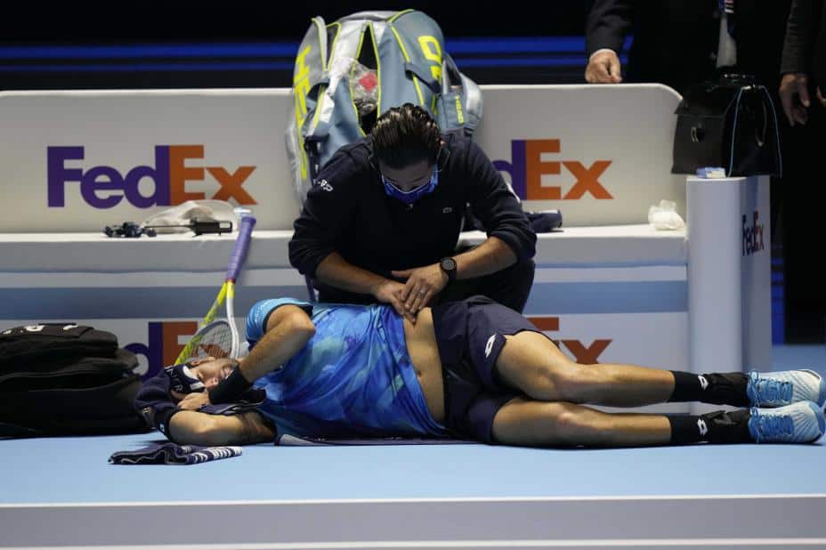 Matteo Berrettini måtte gi seg etter bare et drøyt sett i kamp mot Alexander Zverev i ATP-sluttspillet. Er skaden alvorlig, kan Berrettini måtte bli erstattet.