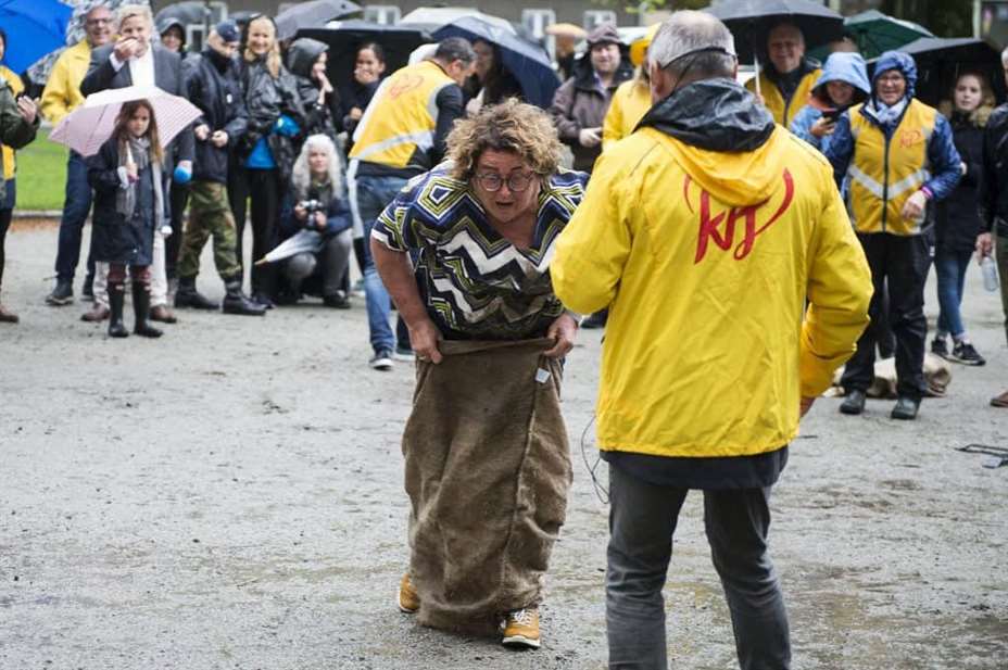 Her går det galt! Olaug Bollestad mistet balansen under sekkeløpet i Stavanger, hvor hun blant annet konkurrerte med partileder Kjell Ingolf Ropstad og tidligere partileder Knut Arild Hareide. Foto: Carina Johansen / NTB scanpix
