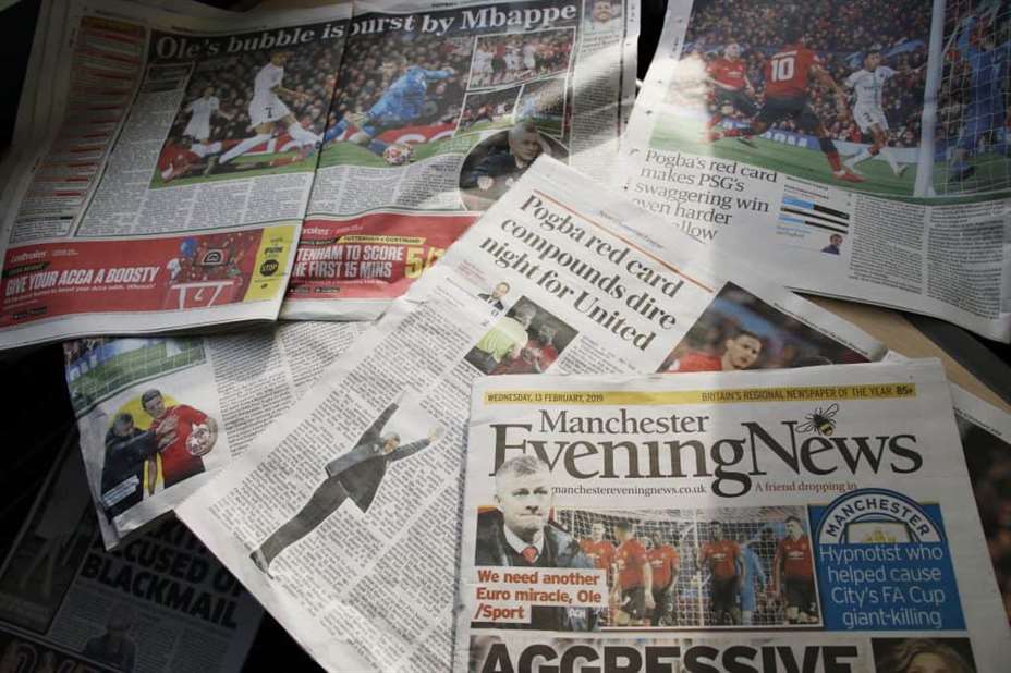 Storavisen The Guardian trekker fram Uniteds «franske lærepenge». Et stort bilde av Kylian Mbappé pryder en forside med undertittelen «Pogba ser rødt når nådeløse PSG stanser Solskjærs ubeseirede rekke».