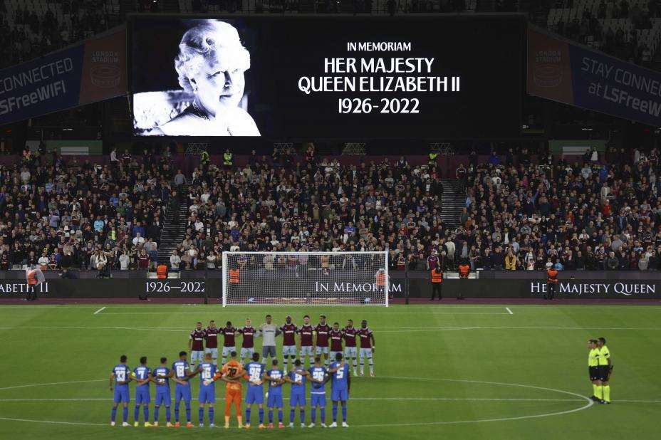 Ett minutts stillhet før avspark i conferenceligakampen mellom West Ham og FCSB på London Stadium torsdag. Foto: Ian Walton, AP / NTB