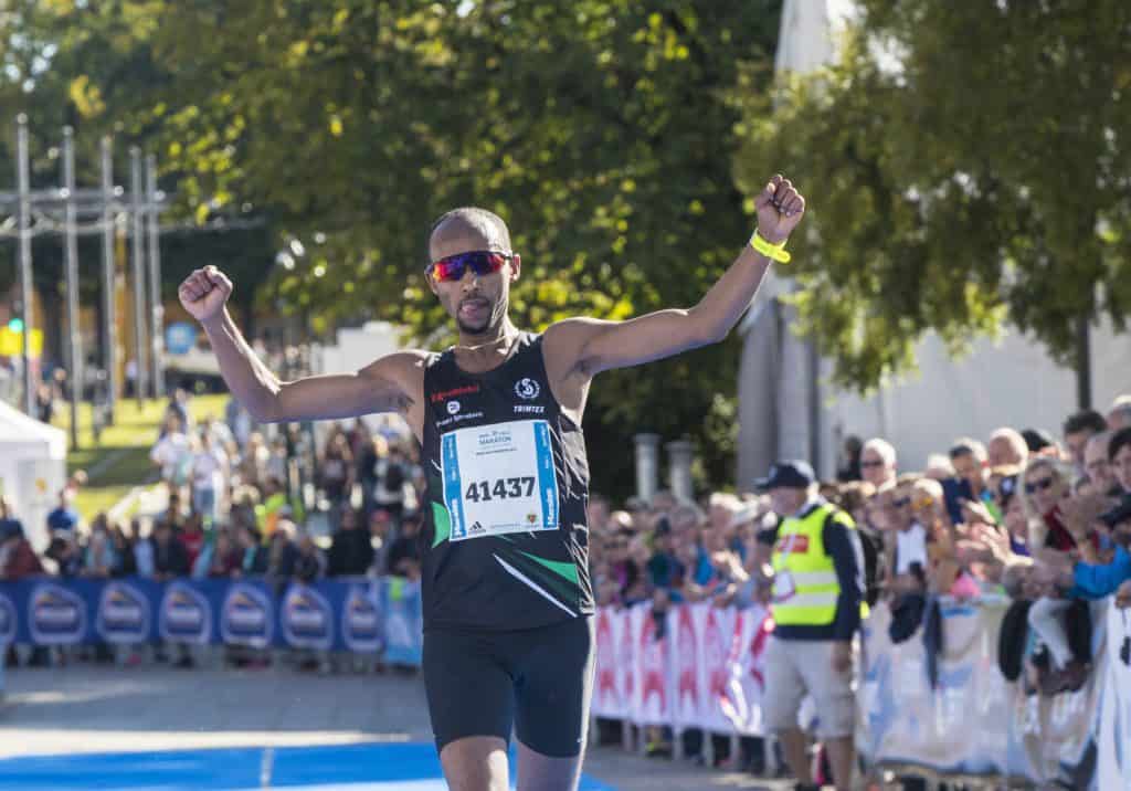 Frew Zenebe Brkineh var nede på alle fire ikke lenge før mål, men reiste seg og løp inn til NM-tittel i maraton. Marthe Katrine Myhre vant kvinneklassen.