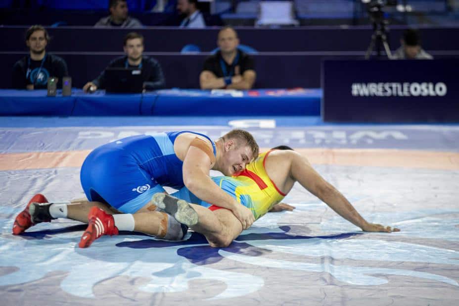 Oskar Marvik åpnet bryte-VM med overbevisende seirer over Alimkhan Syzdykov og Radoslav Georgjev i 130-kilosklassen i Jordal Amfi fredag.