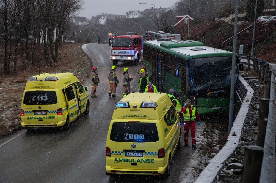 6-7 passasjerer ble sjekket av lege etter at en buss kjørte av veien ved brannstasjonen i Kopervik i formiddag. Bussjåføren satt fastklemt etter ulykken.