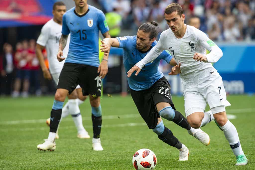 Martín Cáceres, her i duell med franske Antoine Griezmann i kamp for Uruguay i fjorårets VM-sluttspill, er klar for Juventus for tredje gang i karrieren. Foto: Svein Ove Ekornesvåg / NTB scanpix