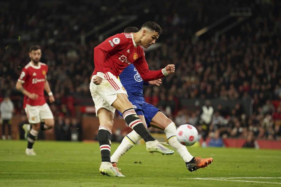 Her gjør Cristiano Ronaldo 1-1 mot Chelsea på Old Trafford. Foto: Dave Thompson / AP / NTB.