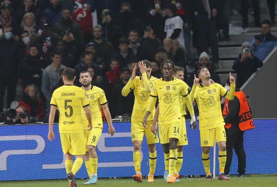 Christian Pulisic (t.h.) omfavnes av lagkamerater etter å ha scoret for Chelsea mot Lille i mesterligaen. Foto: Michel Spingler / AP / NTB