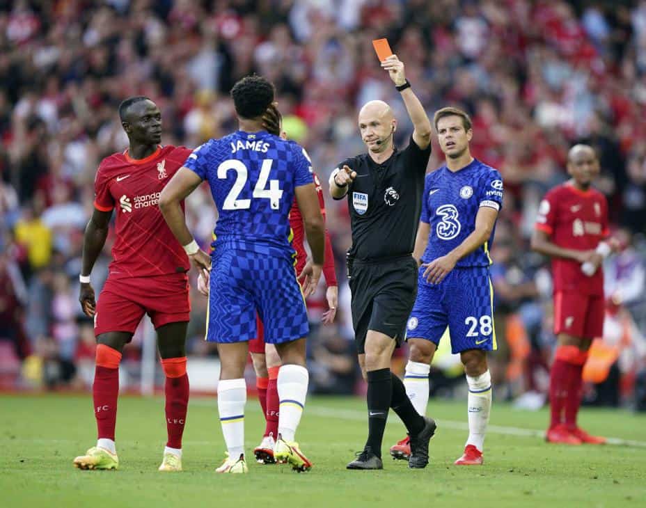 Chelsea-spillerne var svært misfornøyde med at dommer Anthony Taylor blåste straffespark og ga rødt kort til Reece James etter en hands på målstreken.