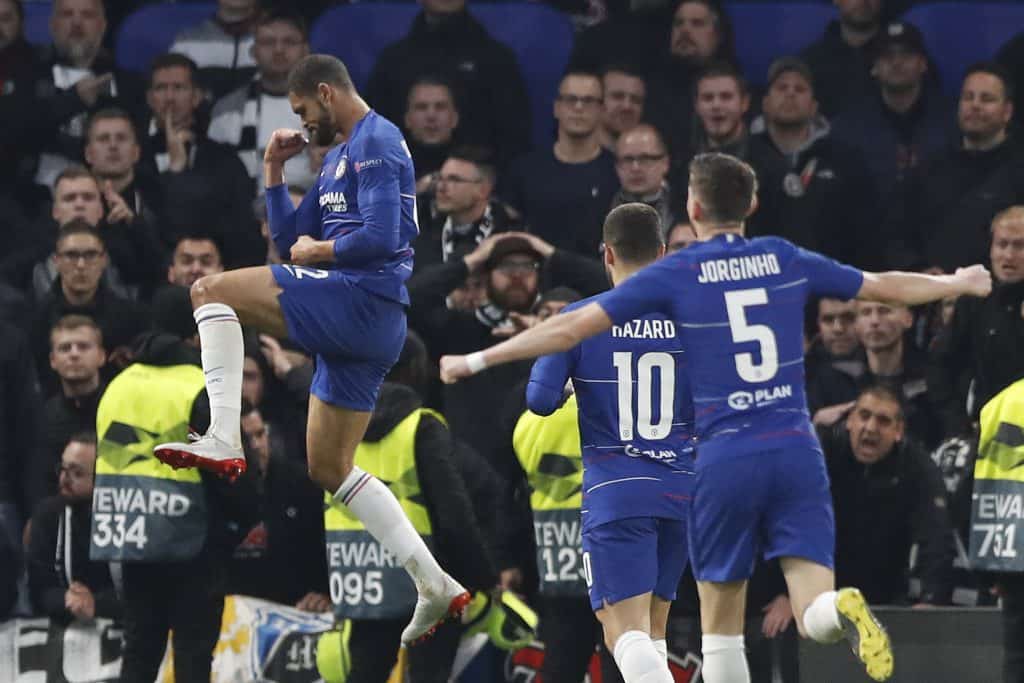 Ruben Loftus-Cheek (til v.) jubler etter å ha gitt Chelsea ledelsen mot Eintracht Frankfurt i europaligasemifinalens returkamp. Foto: Alastair Grant, AP / NTB scanpix