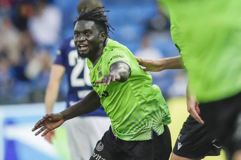 Sport: Senegaleseren kunne sette ballen i et åpent mål. I forkant gjorde Godset-keeper Viljar Myhra en sterk redning, men greide ikke å stoppe Coly fra å løpe inn KBKs vinnerscoring.