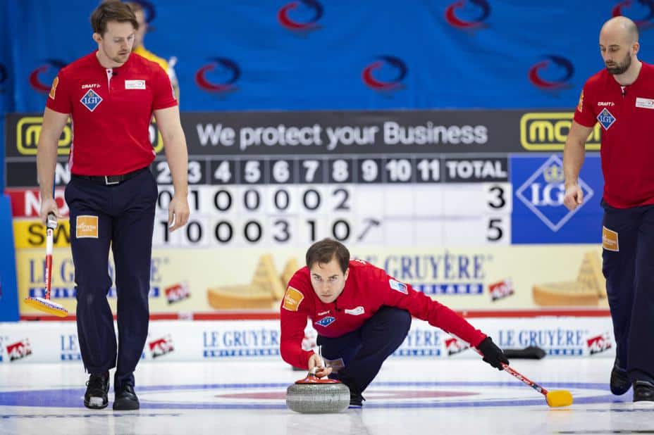 Magnus Vågberg, Steffen Walstad (setter steinen) og Torger Nergård i en kamp mot Sverige i curling-EM tidligere i uken. Foto: Geir Olsen / NTB