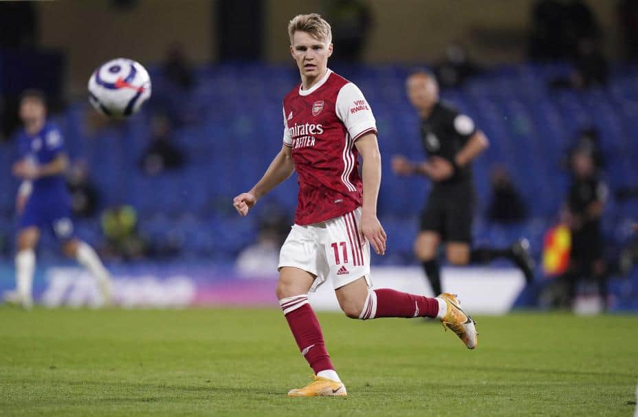Spotify-gründer Daniel Ek bekreftet lørdag at han har lagt inn et bud på Arsenal, men fått det avslått. Her er Martin Ødegaard i aksjon i onsdagens seierskamp mot Chelsea. Foto: Adam Davy, Pool via AP / NTB