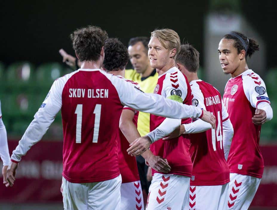 Sport: Andreas Skov Olsen, Simon Kjær, Christian Nørgaard og Joakim Mæhle scoret for danskene i en solid første omgang, og Moldova var aldri i nærheten av å true gjestene.