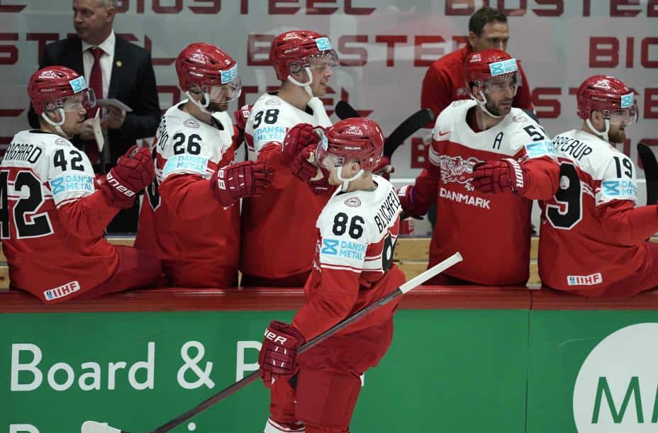 Sport: Storseieren gjør at danskene topper VM-gruppe A etter at seks av åtte lag har vært i aksjon. Hele sju ulike spillere noterte seg på scoringslista, og USA-proffen Joachim Blichfeld scoret tre ganger.
