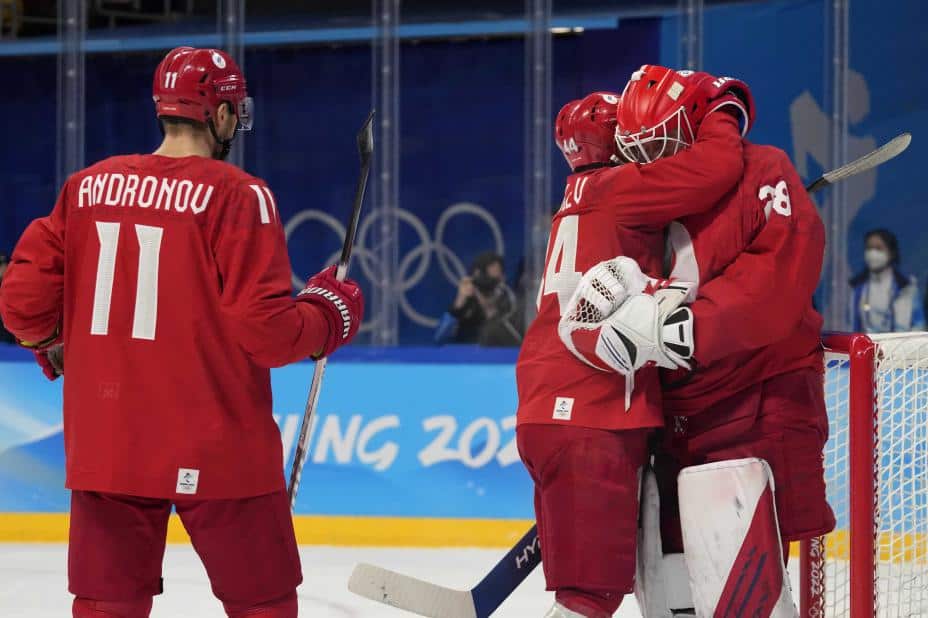 ROC feirer kvartfinaleseieren over Danmark i OL-turneringen i ishockey. Jegor Jakovlev omfavner keeper Ivan Fedotov, som spilte godt da danskene presset på 2-1. Foto: Petr David Josek, AP / NTB