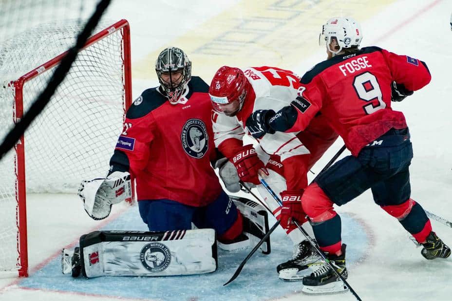 Sport: Det ble en sur avslutning på fredagens oppgjør sett med norske øyne. Først snek Joachim Blichfelds skudd seg forbi Jonas Arntzen i det norske buret. Målvakten fikk sikten svekket av å ha mange spillere foran seg.