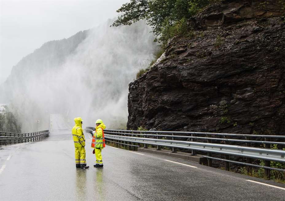 Politiet måtte sette opp manuell dirigering ved Svandalsfossen tirsdag kveld. Store nedbørsmengder førte til at fossen gikk langt ut over veien og tok med seg stein og sand.