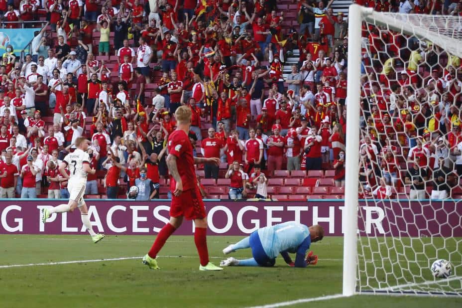 Kevin De Bruyne kom inn og vendte kampen da Belgia gikk videre i EM med 2-1 over Danmark. Han unnlot å feire vinnermålet sitt.