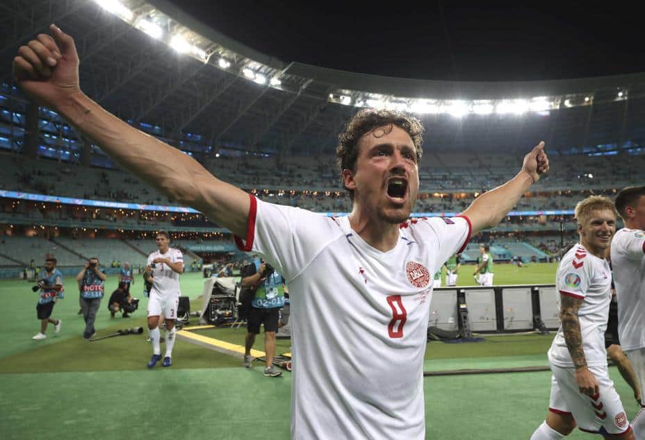 Kvartfinalen i Baku var bare fem minutter gammel da det eksploderte. Thomas Delaney kom seg fri i feltet på dødball og headet ballen kontant i mål.
