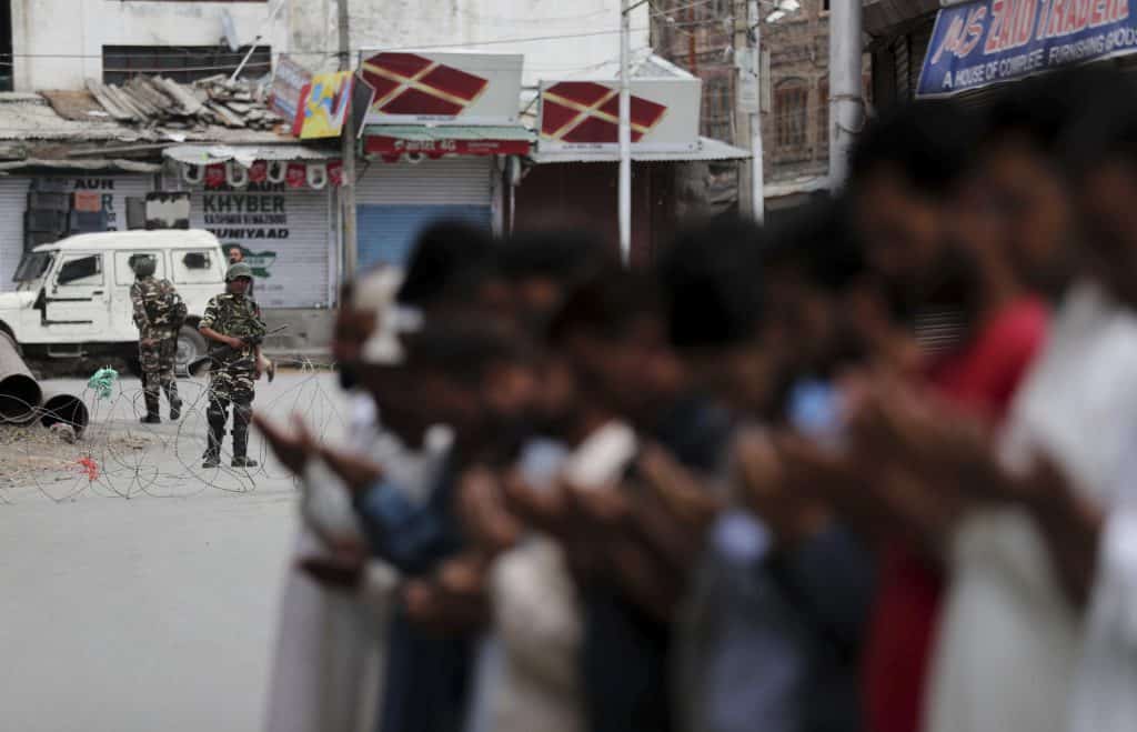 Paramilitære indiske soldater holder vakt under fredagsbønn i Srinagar tidligere fredag. Foto: Mukhtar Khan / AP / NTB scanpix