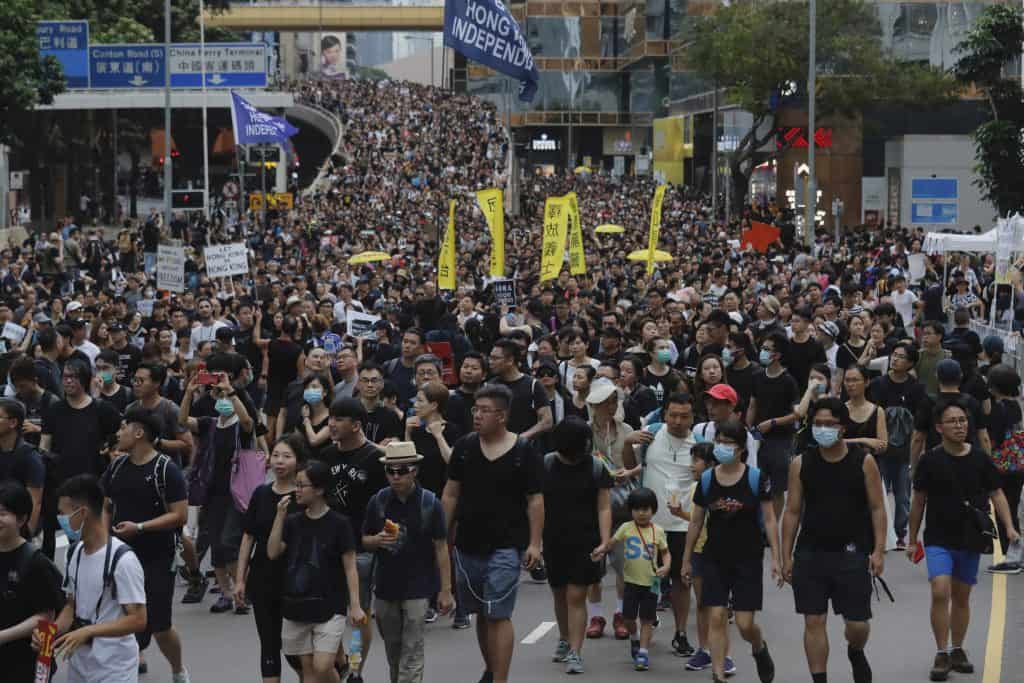 Titusenvis av anti-regjeringsdemonstranter er samlet utenfor en togstasjon som forbinder Hongkong med Kina.